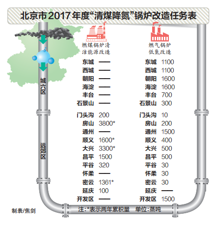据悉,“清煤降氮”工程是完成2017年PM2.5年均浓度达到60微克/立方米目标的重要保障措施。根据2017年清洁空气行动计划的任务分解要求,2017年10月底前,全市要基本淘汰远郊区平原地区10蒸吨及以下和建成区35蒸吨及以下燃煤星空网(中国),完成4000蒸吨左右燃煤星空网(中国)清洁能源改造任务,新建的燃气星空网(中国)都必须达到氮氧化物30毫克/立方米的排放限值。其中,房山区、大兴区要淘汰包括燃煤集中供热中心在内的燃煤星空网(中国),实现辖区平原地区基本无燃煤星空网(中国)。到2017年年底,各区要在政府网站上向社会公开辖区剩余未改造的在用燃煤星空网(中国)清单,接受公众监督。
