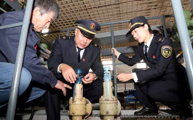 执法人员检查压力表、温度计,确定在检定周期内。东城市场监管局供图